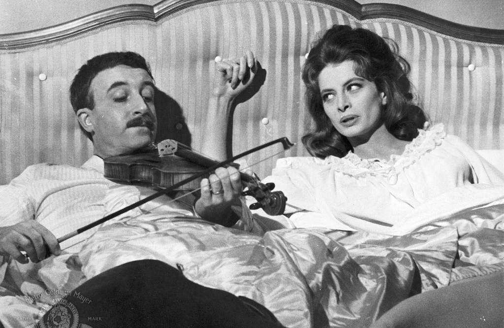 In THE PINK PANTHER, Inspector Clouseau (with his Stradivarius violin and the gabardine Scotland Yard style) is called to unravel the mysterious robberies carried out by the criminal THE PHANTOM, always at parties of the wealthy of the international jet set (a homage about TO CATCH A THIEF, by Alfred Hitchcock). His main suspect is the noble Englishman Sir Charles Lytton (David Niven, magnificent). The type gallery that Blake Edwars (also author of the script) created in this film is impressive: Closeau’s unfaithful wife (in every way), Simone, made by the great Capucine (French actress of excellence), Princess Dala (Claudia Cardinale young and beautiful), owner of the most famous diamond in the world, the Pink Panther and George Lytton (Robert Wagner) swindler nephew of Sir Charles).