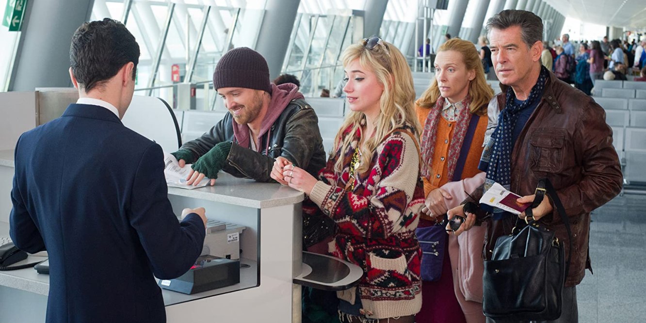 The suicidals are Martin (Pierce Brosnan), a famous TV presenter who fell in disgrace because in one of his infidelities he had sex with a minor, which made him lose his job, his marriage and spend time in prison; Jess (Imogen Poots), the rebellious daughter of the Secretary of Government for Education, suffering from the disappearance of her older sister; Maureen (the always great Toni Colette), the mother of a boy who suffers from incurable paralysis; and J.J. (Breaking Bad’s Aaraon Paul), a pizza delivery man who claims to have incurable brain cancer.