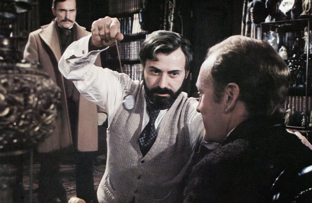 Nicholas Meyer‘s SOLUTION SEVEN PERCENT (1976) shows Detective Sherlock Holmes‘ trip to Vienna to deal with Freud about cocaine addiction. Alan Arkin plays Freud, while Sherlock is actor Nicol Williamson and Watson is Robert Duvall. A great movie.