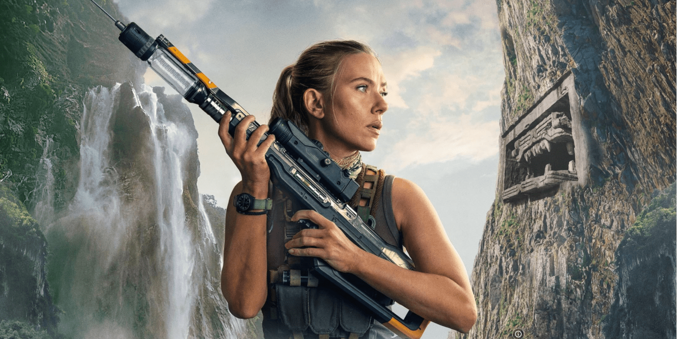 Esse atual JURASSIC WORLD RECOMEÇO, de Gareth Edwards, tem o poderoso acréscimo de Scarlett Johansson. Ela faz uma mercenária poderosa. A primeira vez que aparece está de terninho impecável a bordo. de um carro em Manhattan, com o cabelo preso num coque.